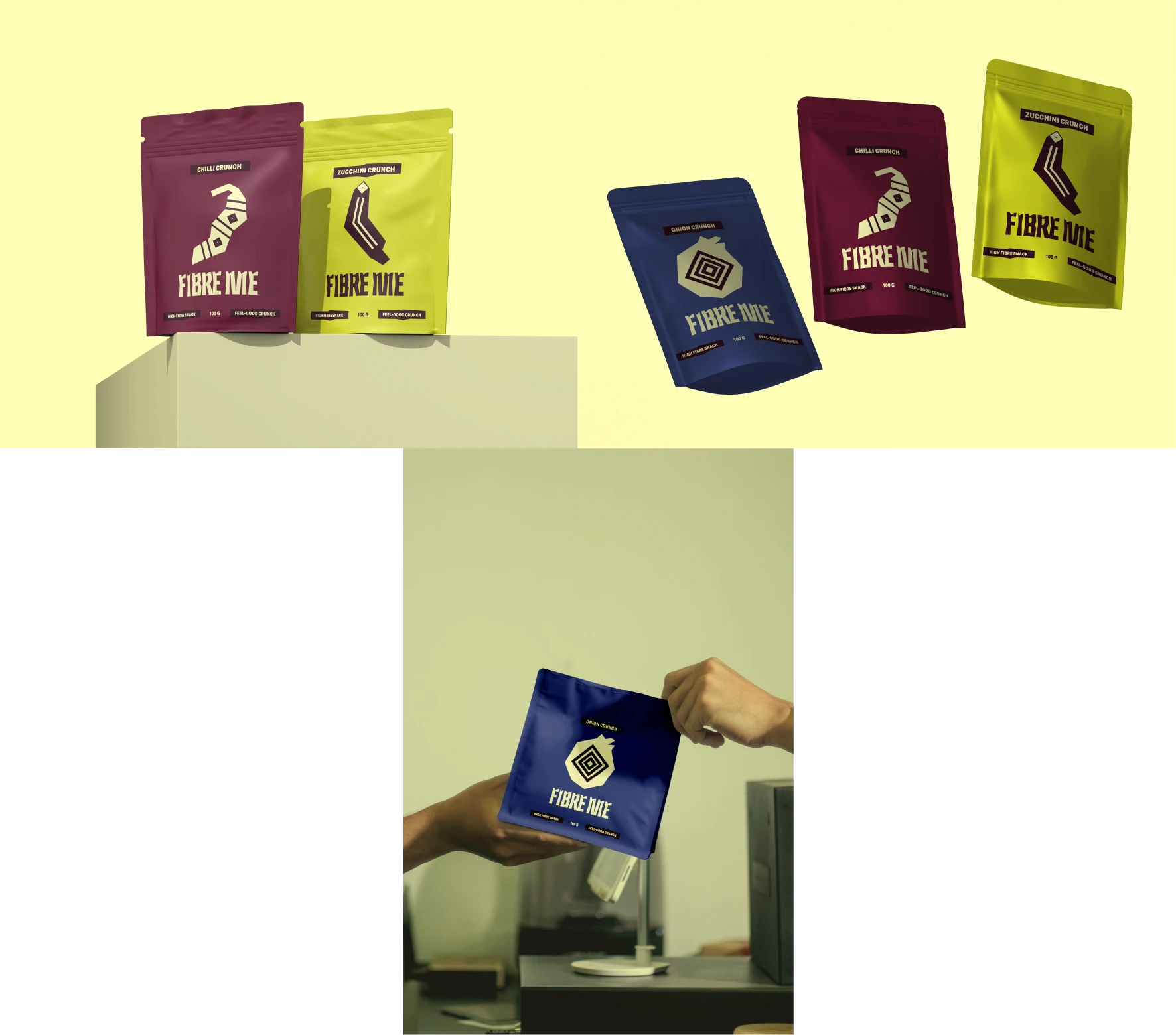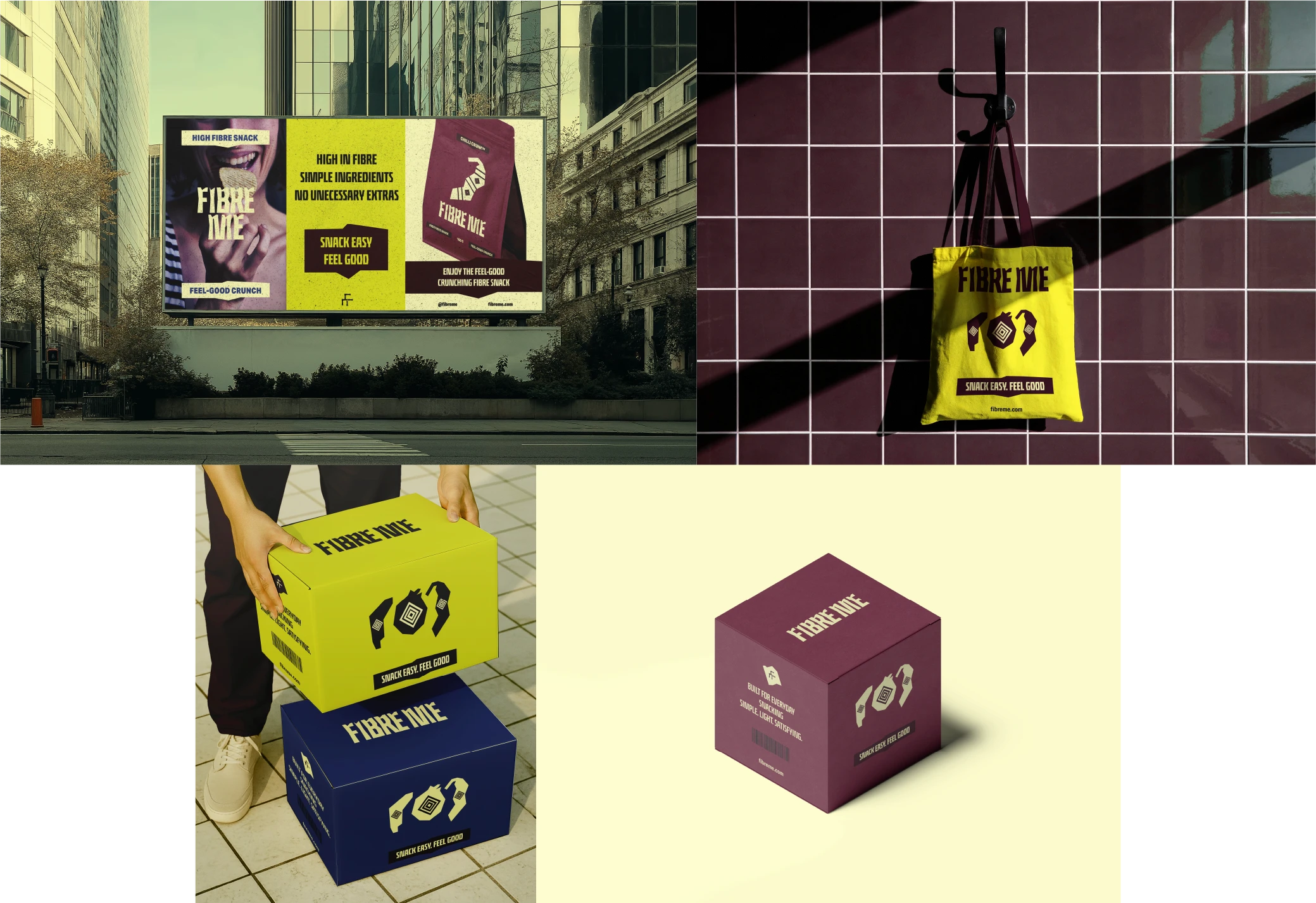 Fibre Me is a modern snack brand focused on high-fiber, feel-good crunch. The identity combines bold typography with a minimal, structured system to create a clean yet distinctive brand experience.